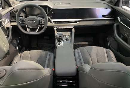Интерьер Geely Monjaro поражает своей палитрой оснащения: шумоизолирующие передние стёкла, высококачественные материалы, кожа и приятная на ощупь замша, панорамная крыша с люком, трёхзонный климат-контроль, подогрев руля, лобового стекла, подогрев и вентиляция сидений, многоцветная атмосферная подсветка и премиальная аудиосистема с системой активного шумоподавления и 10 динамиками. Замшевая обивка потолка чёрного цвета придаёт премиальный статус этому автомобилю.